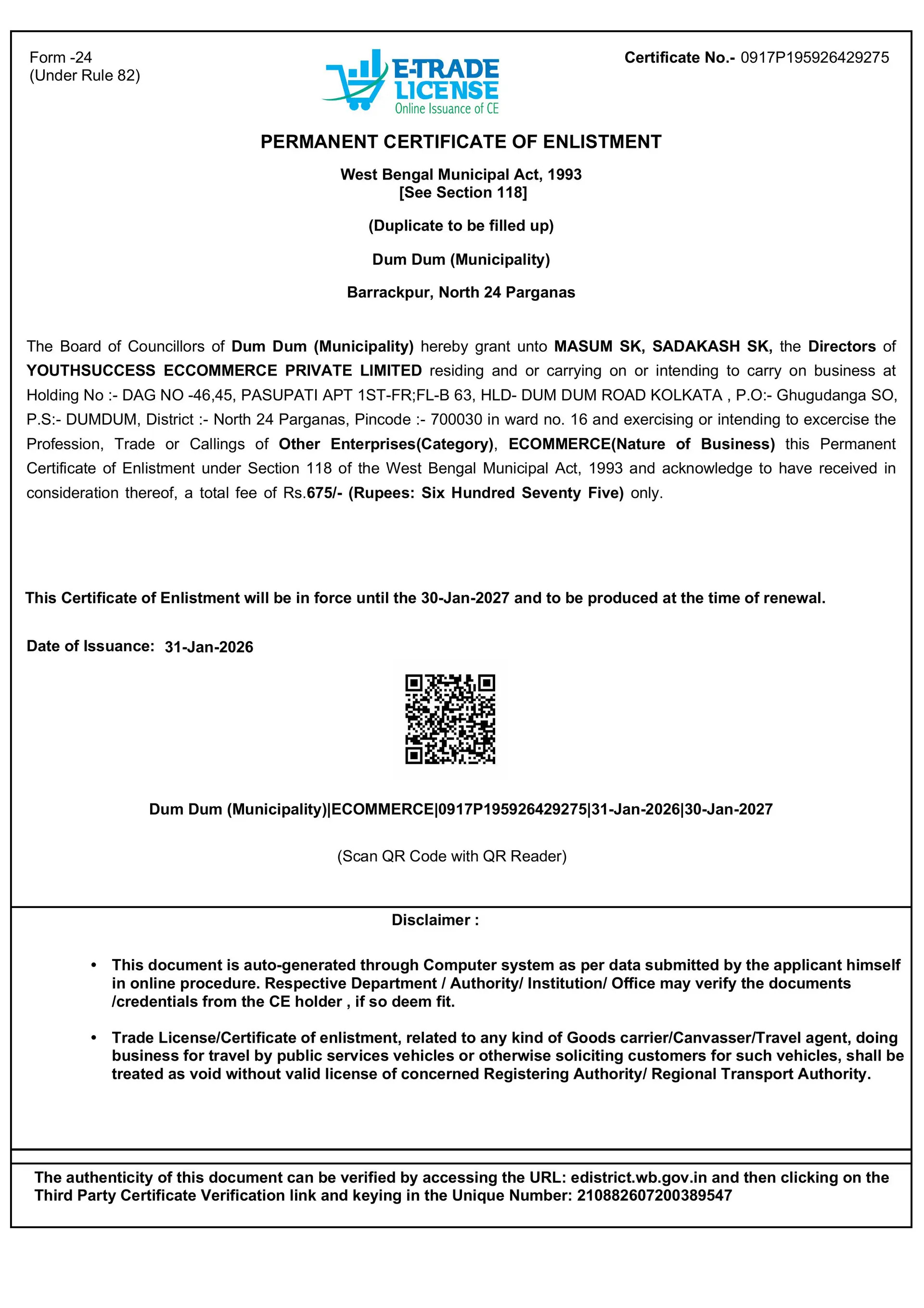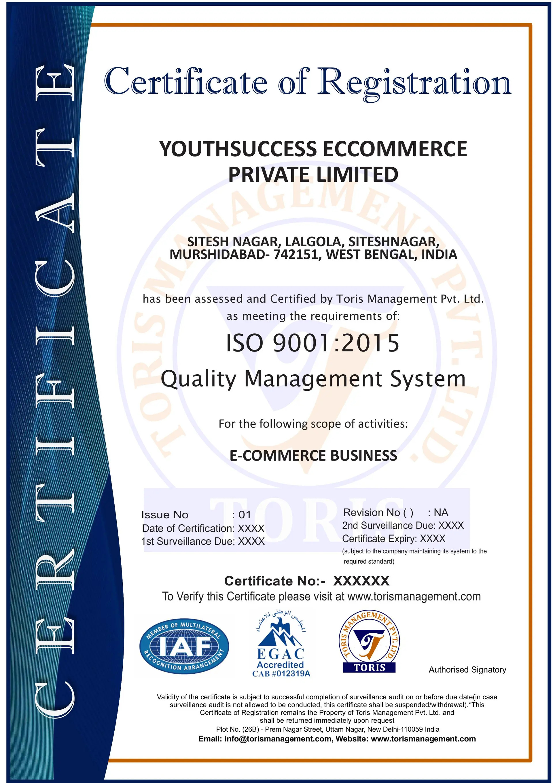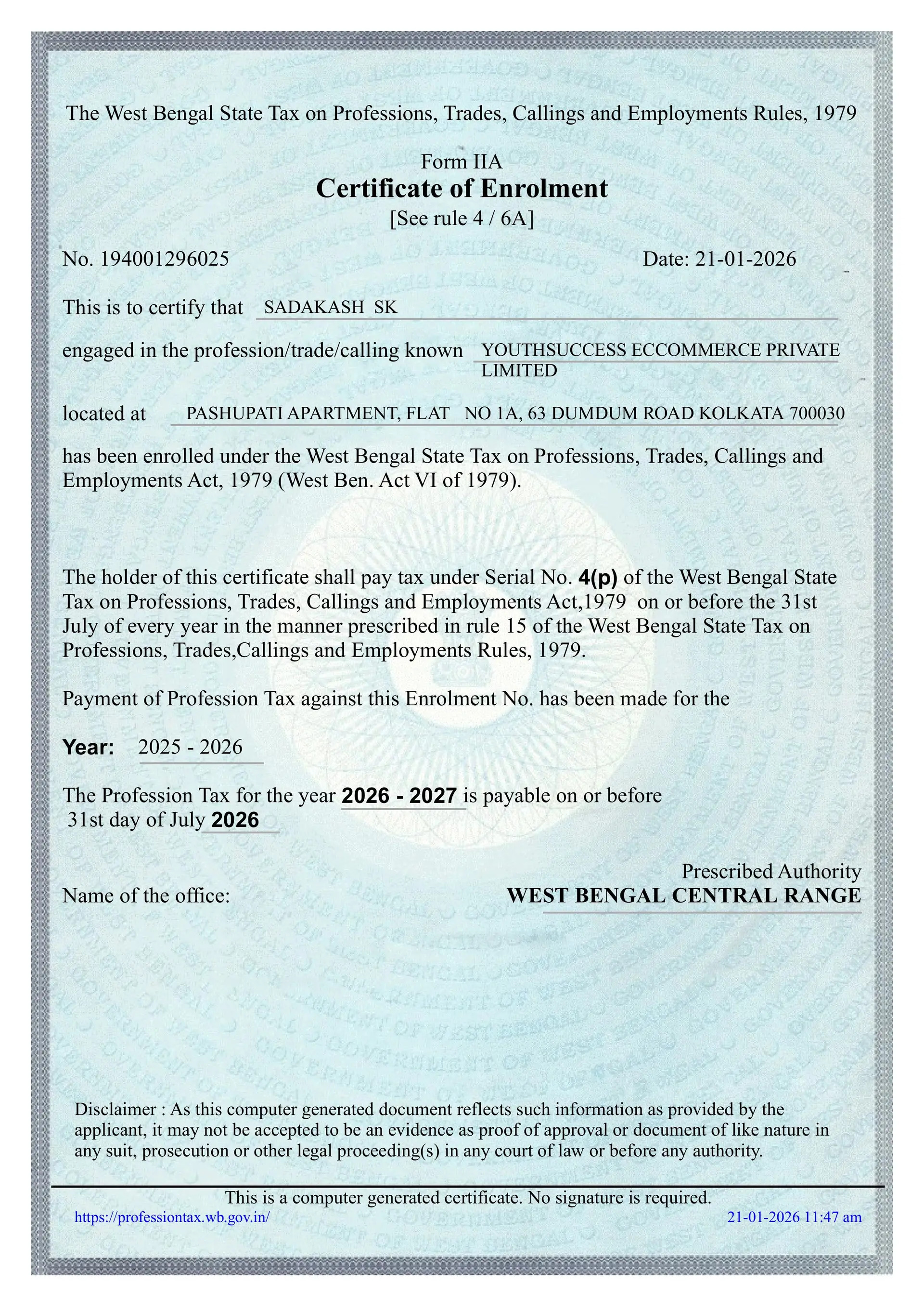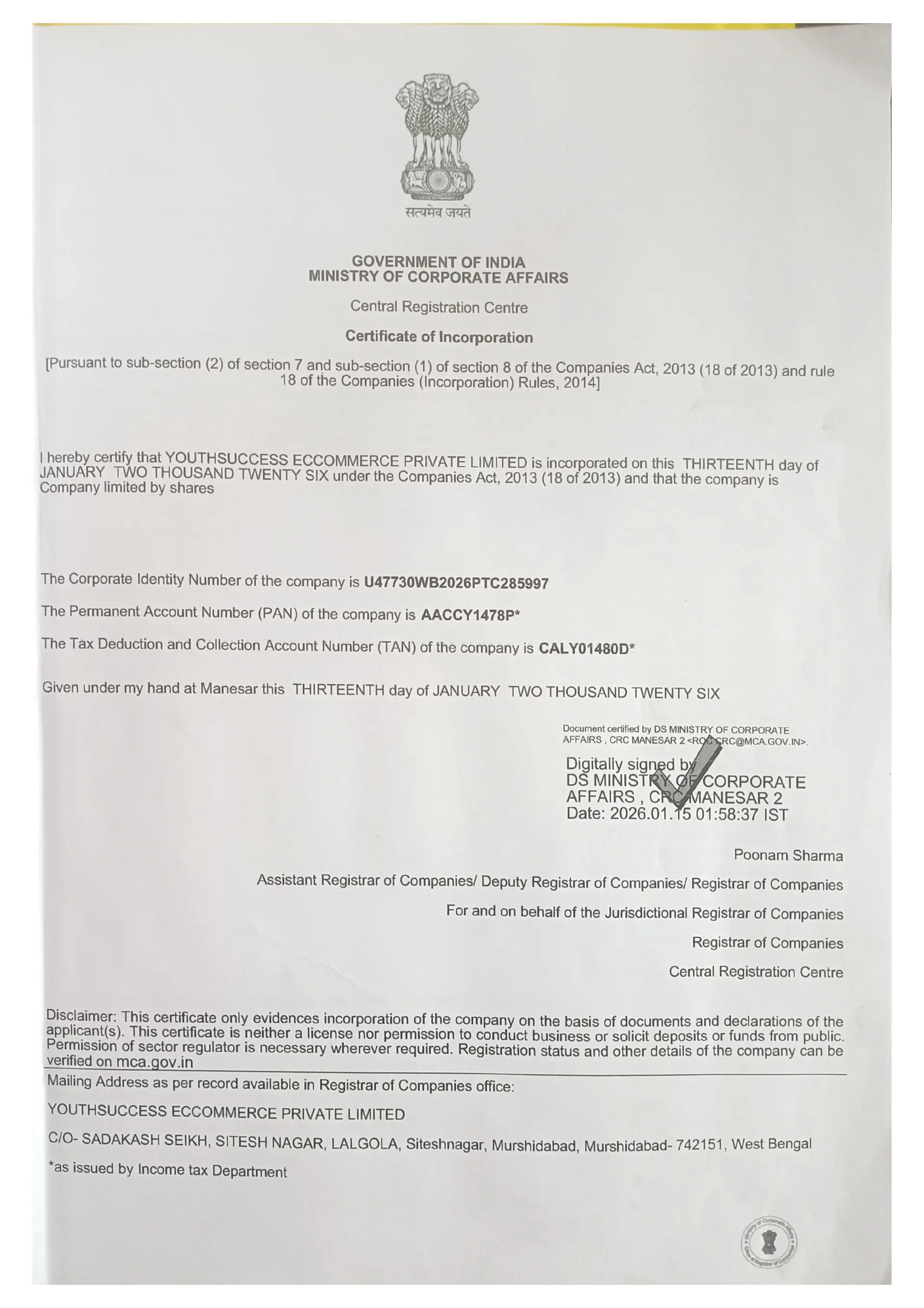Official registrations and compliance documents of YouthSuccess Ecommerce Pvt. Ltd.
